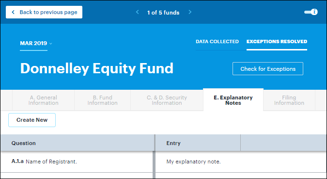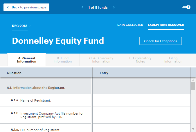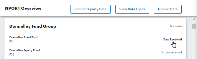 You can review and manage data collected for form N-PORT on a fund-by-fund basis by using the “Data Received” link on the overview screen. In this mode of review, potential data validation exceptions within filings are highlighted so you can resolve or clear them.