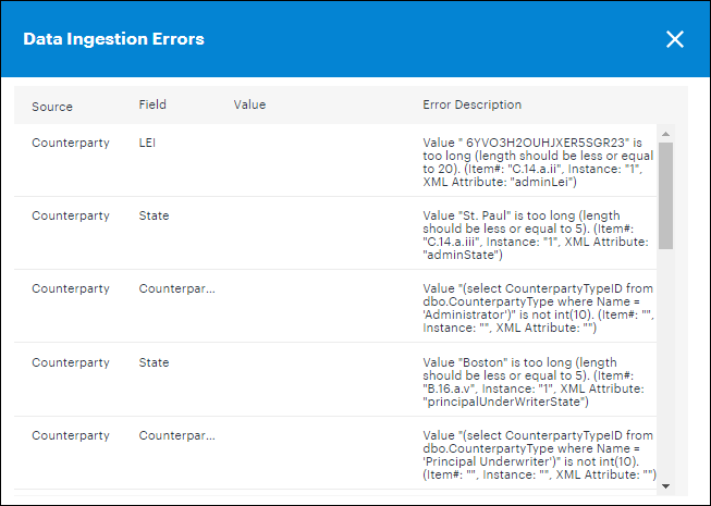 “Data Ingestion Errors” dialogue - Click the “x” button at upper-right of the dialogue to close the dialogue.