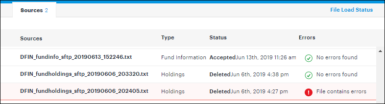 Clicking a fund’s name opens the “Sources” screen, which displays the name of the file that was loaded for each load type, as well as the status and time of file acceptance. For the initial release, the source file name will be auto-generated, and will be the same file name for each load type.