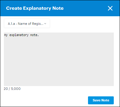- Enter the desired value in the text box that displays on the “Create Explanatory Note” dialogue, and then click the “Save Note” button to effect the update. Click the “x” button at upper-right of the dialogue to cancel the update.