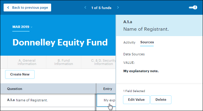 For certain N-PORT filing questions, information will be automatically rolled forward when data is ingested for the account period. However, you also have the option to manually pull values from the previous account period to populate the current filing by clicking the “Edit Value” button at the bottom of the info panel.