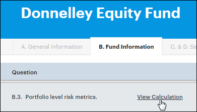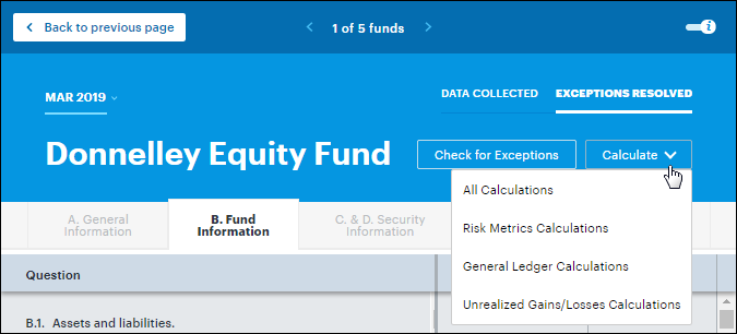 You can calculate values for specific questions by clicking the “Calculate” button at upper-right of the “B. Fund Information” tab, and then selecting the calculation(s) you’d like to run.