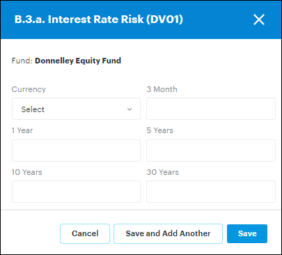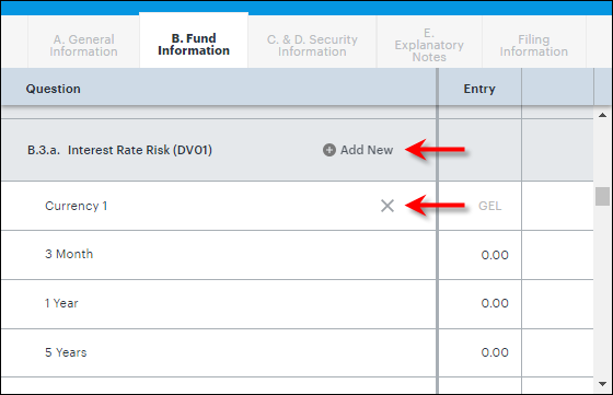For question B.3, selecting “Risk Metrics Calculation” causes logic to be carried out to determine if the fund’s notional value of debt securities is above the 25% threshold (in which case an answer to the question is required for the fund).