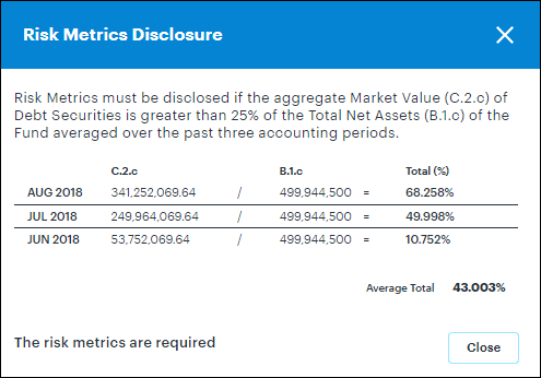 “Risk Metrics Disclosure” dialogue - A message is displayed at lower-left of the dialogue to indicate whether or not the risk metrics are required for the current fund.